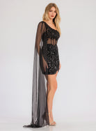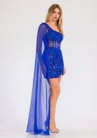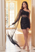One Shoulder Cape Leaf Lace Bodice Short Cocktail Dress