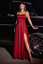 Rust, Black, Royal Blue, Purple | Satin A-Line Dress with Spaghetti Straps and Side Slit CDB8402