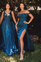 Satin Prom Gown: High Leg Slit, Off Shoulder, Draped Bodice, Open Back CD7488