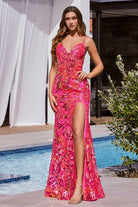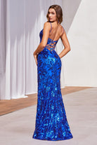 This Sequin Printed Fitted Side Slit Open Back Long Prom Dress CDCM350 is an ideal choice for any special occasion. Its fitted silhouette, sequin floral print fabric, and deep v-neckline will surely make you stand out and feel beautiful. Not only does it offer comfort and style all night long, but the boned bodice and leg slit also enhance your figure in the most flattering way.