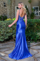 Elegant and figure-flattering, this fitted floor-length evening dress features delicate spaghetti straps that frame a sheer V-neckline corset bodice, lavishly adorned with sparkling jewels. A defined Basque waist transitions into a pleated stretch satin skirt, with crossover detailing at both the front and back. A thigh-high slit completes the look, adding a bold and modern touch to this glam design.