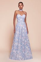 This A-line dress features a strapless sweetheart neckline and a fitted bodice with a removable belt or sash at the gathered waistline. Crafted from soft satin in a delicate floral print, the flowy skirt adds an elegant touch. Perfect for bridesmaids, wedding guests, or formal events, this dress offers both style and grace.