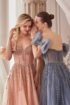 Blush Nude, Dusty Blue | Off-Shoulder Beaded Tulle Gown with 3D Petal Accents & Sweetheart Corset CDA1338