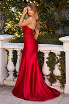 Strapless Satin Corset Gown with Beaded Bodice and Thigh Slit – Royal Blue & Red