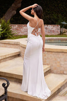 This show-stopping glitter gown will take your evening look to the next level. The fitted off-white silhouette is highlighted by a gathered bodice, cowl neckline, and thin straps that create a delicate, feminine shape, as well as a spectacular open lace-up back that will provide an unforgettable entrance.