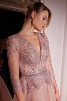 Rose Gold A-Line Evening Gown with Sequin Lace Bodice & 3/4 Sleeves CDCD789