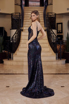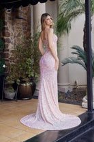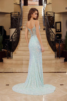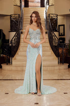 Discover the stunning Iridescent Sequins with a V Neckline Sheer Boned Waistline Spaghetti Straps — a beautiful prom gown designed for prom night, formal dances, and evening galas. This elegant style features refined detailing and a flattering silhouette that ensures you look unforgettable.