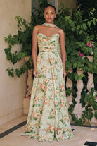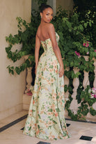 This enchanting floral chiffon gown captures timeless garden elegance with refined details. The sweetheart neckline and ruched bodice create a romantic aesthetic, while the structured corset back provides essential support and definition. The graceful A-line skirt offers flattering silhouette enhancement and fluid movement. Accompanied by a coordinating detachable scarf for styling versatility, this dress is expertly suited for spring celebrations, formal garden events, and bridal party occasions.