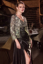 This fit-and-flare gown exudes sophistication with its liquid taffeta fabric, delicate V-neckline, and elegantly gathered waistline. A removable long-sleeve jacket adorned with a shimmering crystal floral motif adds a refined touch, offering both coverage and versatility. Ideal for mothers of the bride or any formal occasion, this ensemble blends timeless elegance with a modern, graceful silhouette.