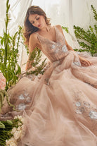 Introducing the Lilian ball gown, a dreamlike garment that possess all the beauty and romance of a fairy tale. With its V-neckline, beaded rose appliques, and sheer boned bodice, this enchanting dress will make you feel like you stepped right out of a garden scene.
