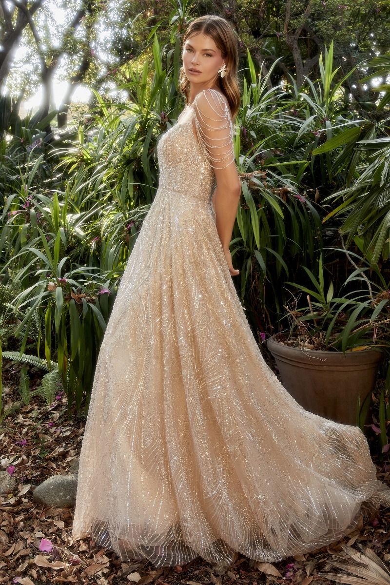The grand entrance will be enchanting as you glide into the room wearing this sparkling creation. With its luminous silhouette, this dress will make you feel like a luxurious goddess or fairytale princess. It is adorned with shimmering glass beads, and the straight neckline adds an elegant and sophisticated touch.