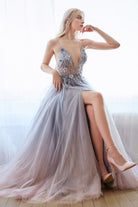 Daphene Tulle Skirt Side Slit V-Neck Sheer Embroidered Bodice Long Prom Dress CDA0850