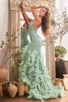 Feathered Mermaid Open Criss Cross Back Illusion V-Neck Long Prom Dress