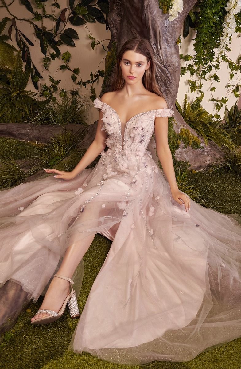 Crafted from exquisite organza and adorned with couture beading, the bodice features an off-shoulder décolleté and plunging v-neck. A delicate blush hue and 3D floral appliques complete the look, while a romantic A-line silhouette and leg slit evoke a timelessly feminine feel. Embrace your inner queen and immerse yourself in a fairytale with this spectacular gown.