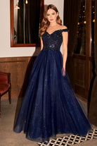 Off Shoulder A-line Sequin Bodice Glittery Layered Tulle Skirt Long Prom & Bridesmaid Dress CDCD0177