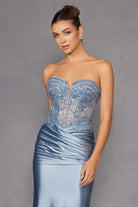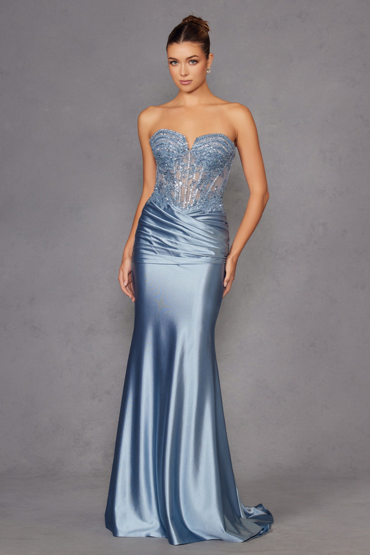 Make a grand entrance with our exquisite beaded evening gown. This elegant dress features a fitted bodice adorned with intricate beadwork and sequin embellishments, creating a captivating sparkle. The gown is strapless with a slight V neckline, accentuating the waist before flowing into a full, floor-length skirt that drapes beautifully. Perfect for formal occasions, this gown is designed to make you feel like the belle of the ball.