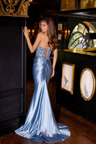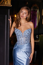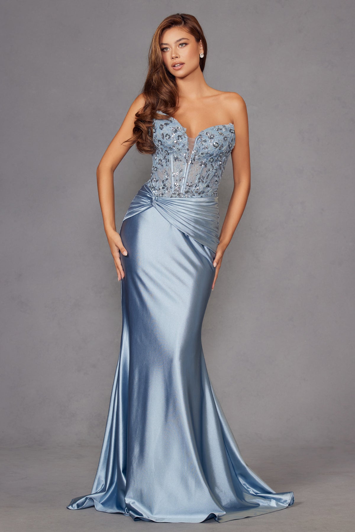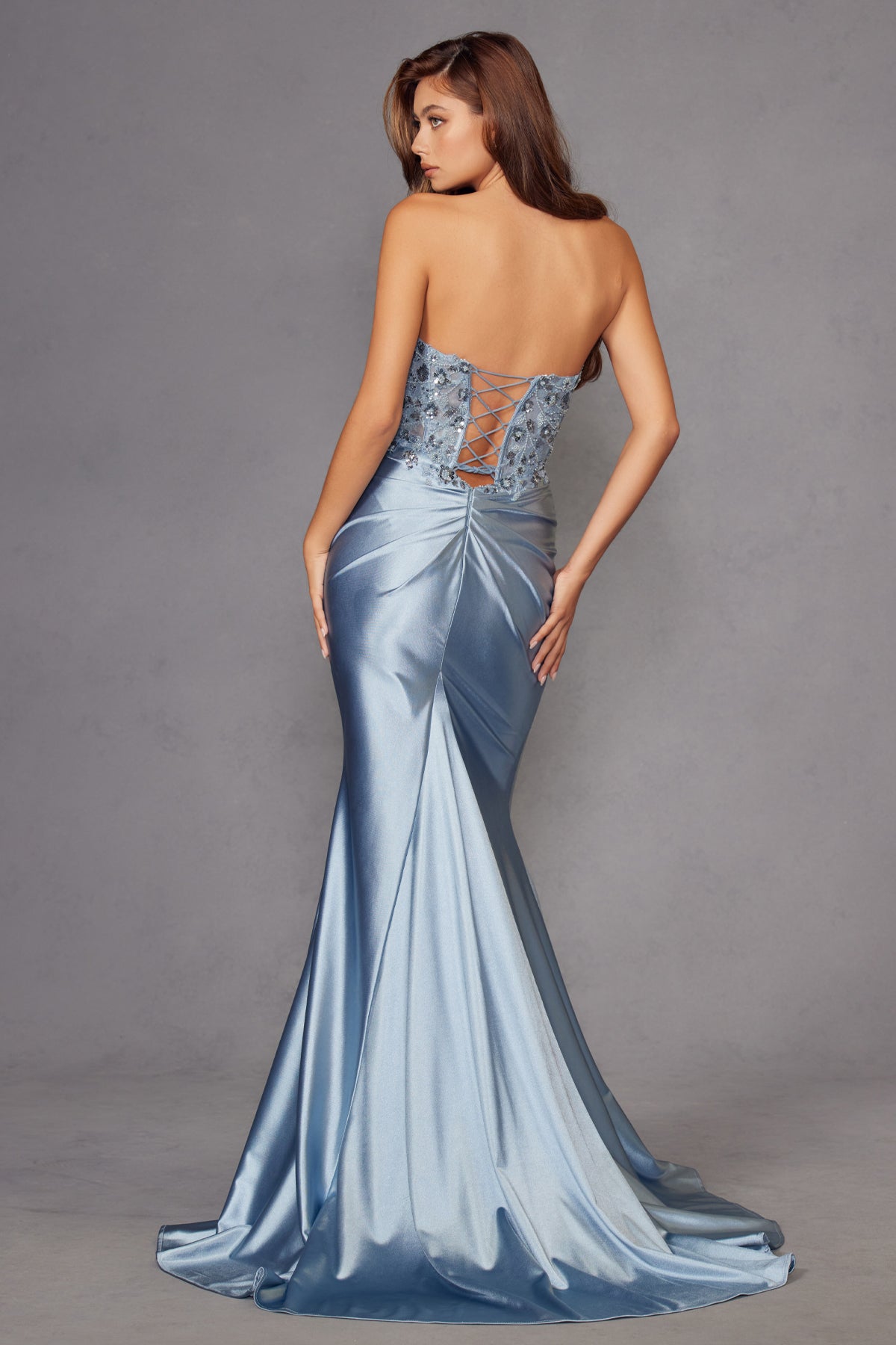Step into the spotlight with this exquisite two-tone evening gown, a perfect blend of classic glamour and modern elegance. The bodice, adorned in a rich, shimmering floral design, is embellished with intricate beading and sequins that catch the light perfectly. Transitioning from the ornate bodice, the gown features a smooth interplay of textures with ruched fabric cinching at the waistline, adding depth and contour. This ruching detail extends asymmetrically across the midsection and hips, enhancing the gown’s sculptural quality. The back of the dress is equally captivating, with additional ruching that adds texture and flatters your curves. Perfect for formal occasions, this gown promises to make you feel elegant and unforgettable.