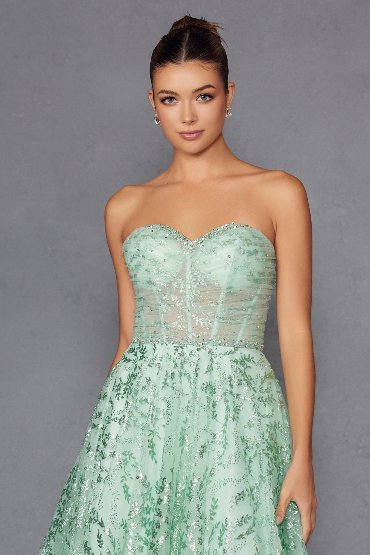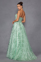 This stunning dress features a sweetheart neckline with a fitted bodice that flares out from the waist into a full-length skirt. The entire garment is adorned with sequined embellishments, giving it a textured and ornate appearance. The dress has no sleeves and is designed to contour closely to the body before extending into a voluminous skirt, making it perfect for evening events or formal occasions.