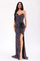 Elevate your evening with this stunning sheath gown that commands attention. The sweetheart neckline and strapless silhouette create an elegant, timeless look, while the sleek zip back ensures a perfect fit. Intricate beading and rhinestone embellishments catch the light beautifully, complemented by a delicate bow accent that adds refined detail. The leg slit provides graceful movement and modern sophistication. Designed for those special occasions where you want to make an unforgettable impression, this long gown combines classic elegance with contemporary glamour.