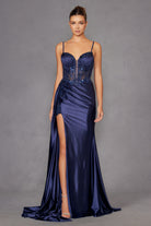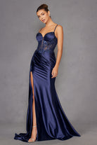 This elegant evening gown is a perfect choice for any formal occasion. The dress features a fitted bodice adorned with intricate beaded embroidery and sequins, creating a sparkling effect. The sweetheart neckline and structured boning enhance the form-fitting silhouette. The skirt is smooth and draped, with an asymmetrical gathering at the waist that cascades into an elegant side slit, revealing part of the leg. A sheer overlay extends from the waistline, adding an extra layer of fabric that flows gracefully to the hem of the dress. This combination of classic elegance and modern design details makes this gown a standout piece, ensuring you make a memorable entrance at any event