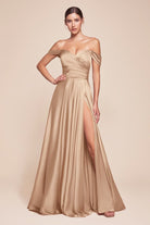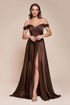 Elegant Off-Shoulder Soft Satin Evening Gown with Ruched Bodice & Pleated Waistline CD 7493