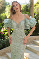Rhinestones Embellished Off The Shoulder Prom Stretch Gown w/ Organza Sleeves CDA1488