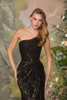 One Shoulder Sheath Fashion Forward Gown w/ Lace Drape & Elegant Leg Slit CDA1497