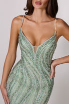 Elevate your evening with this stunning mermaid gown crafted from luxurious tulle. The plunging neckline and delicate straps create an alluring silhouette, while intricate rhinestone embellishments add glamorous sparkle throughout. The floor-length design flows gracefully, culminating in a dramatic mermaid hem that commands attention. A convenient zip closure at the back ensures a seamless fit. Perfect for prom, galas, and red carpet moments, this dress embodies timeless elegance and modern sophistication.