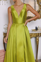 This elegant A-line gown features a luxurious mikado fabric that drapes beautifully from a fitted bodice to a gracefully flowing skirt. The deep V-neckline and sleeveless design create a sophisticated silhouette, while the V-back with concealed zip closure adds modern refinement. The pleated skirt showcases striking box pleats and includes practical side pockets, complemented by a structured waistband. Perfect for formal occasions, this floor-length dress combines timeless elegance with contemporary styling details.