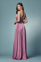 This timeless dress features a double-breasted high slit design with an open criss-cross back, making it perfect for bridesmaids and prom events.