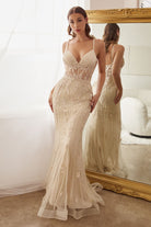 Our sequinned glittery set offers a stunningly intricate embroidery and appliqué for an enviable look. The plunging neckline of the bodice forms a sheer corset, defining your curves in an alluring and tantalizing manner. The silhouette of the mermaid gown skims your figure intimately, maintaining its seductive and striking flair. Glitters add a dazzling effect to the overall ensemble, elevating your style to the next level. Make a statement wearing this energized and captivating dress at proms, cocktail parties, black tie events or galas.
