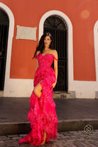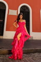 Stun in this bold hot pink high-low corset gown! Featuring a sweetheart neckline, off-shoulder straps, and layered lace with shimmering sequin details, this dress is designed for the ultimate glamorous look. The thigh-high slit adds a touch of allure, making it perfect for proms, galas, red carpets, and formal evening events. Crafted with luxurious fabric, this show-stopping gown enhances your silhouette while offering comfort and elegance. Step into the spotlight with confidence in this breathtaking statement piece!