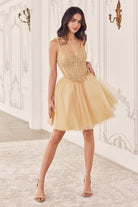 Dusty Blue, Gold & Blush Short Corset Tulle Dress | Sparkly A-Line Mini Party Dress  CDCD0236