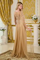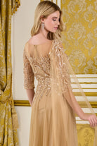 Sophisticated and effortlessly graceful, this floor-length A-line gown is a stunning choice for the mother of the bride/groom. The mesh bodice features a boat neckline and 1/2 sleeves, beautifully embellished with embroidery, sequins, and beadwork. The soft, metallic jersey skirt flows with every step, offering a subtle sheen and airy movement. A Watteau train cascades from one shoulder, adding a modern twist to this timeless silhouette.