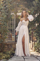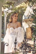 This exquisite floor-length wedding dress features an elegant off-shoulder neckline paired with a flattering A-line silhouette. Its removable puff sleeves offer versatile styling options, allowing for a strapless look. The semi-open back with a zipper closure adds modern appeal, while the skirt's slit provides ease of movement and subtle allure. Delicate butterfly embellishments enhance the design with intricate detail, making it a sophisticated choice for a memorable bridal appearance.